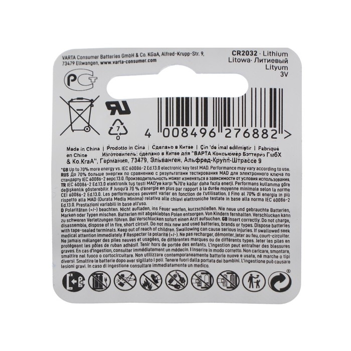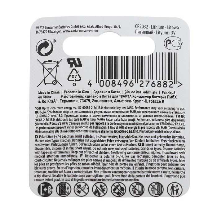 Батарейка литиевая Varta, CR2032-1BL, 3В, блистер, 1 шт.