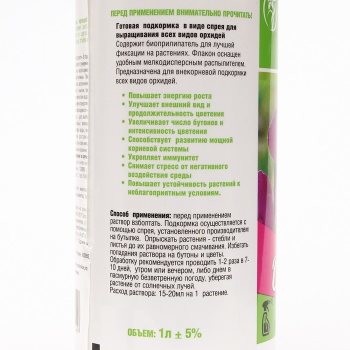 Готовая подкормка в виде спрея для выращивания всех видов орхидей. Содержит биоприлипатель для лучшей фиксации на растениях. Флакон оснащен удобным мелкодисперсным распылителем. Предназначен для внесения для внекорневой подкормки всех видов орхидей.