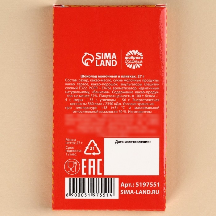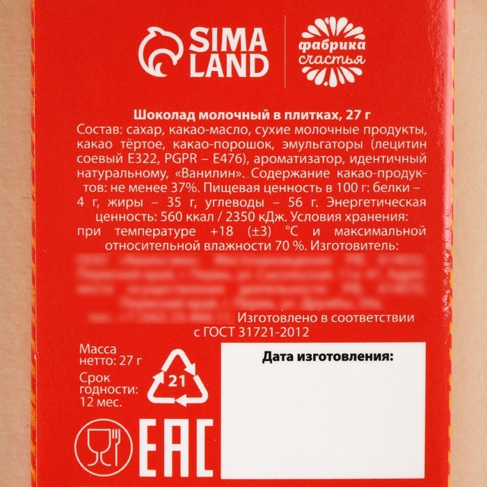 Состав: сухое цельное молоко, какао тёртое, масло какао, сухая молочная сыворотка, обезвоженный молочный жир, сахар, эмульгатор – соевый лецитин, ароматизатор, идентичный натуральному, «Ванилин».