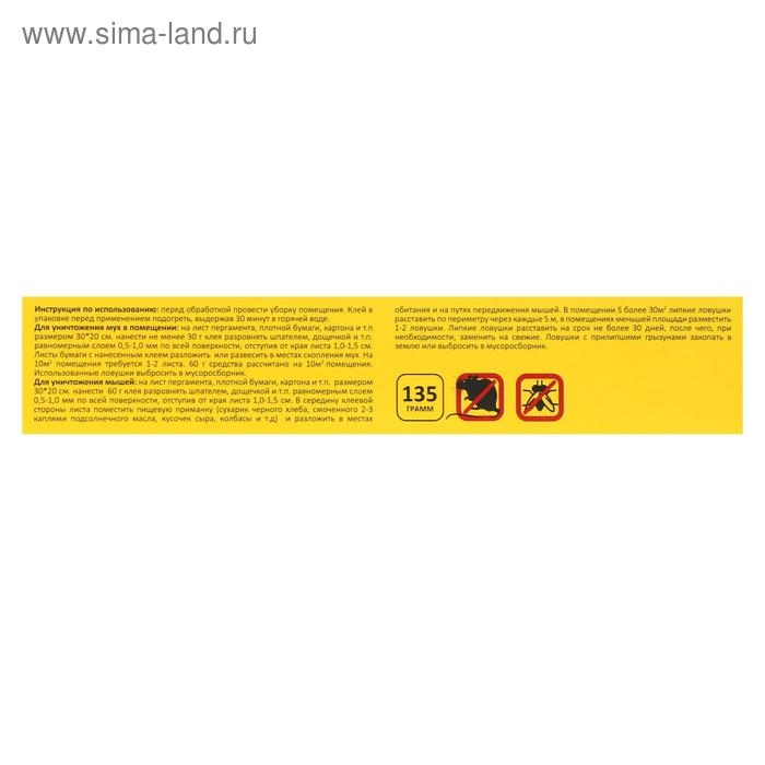 Высокоэффективный клей для отлова грызунов и насекомых. Рекомендуется в качестве нетоксичного средства для борьбы с грызунами. Используется в жилых помещениях (квартира, дом, дача), различных учреждениях (детских, лечебных, образовательных), а также для складов, хранилищ, различных производств и т.п. В любом месте, где нельзя использовать ядовитые препараты, подойдёт клей для ловли грызунов.