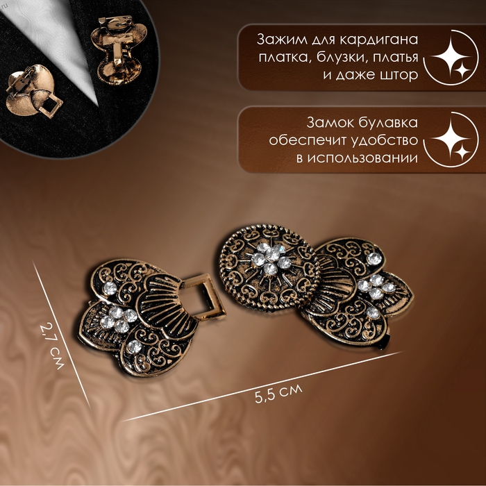 Зажим для кардигана - изысканный аксессуар, в том числе на поверхности платья, шали или свитера, данный элемент можно использовать даже для штор. Зажимы актуальны как в повседневном так и праздничном образе, добавляют очарования вашей одежде при сочетании различных нарядов.