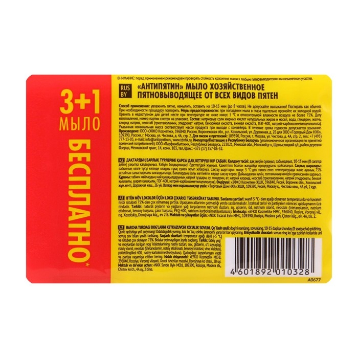 Хорошо известный продукт теперь в промоформате. Это отличный вариант для потребителей, готовых купить впрок и получить приятную скидку! Скидка 25% или 1 МЫЛО В ПОДАРОК. Один продукт - для трех способов применения (стирка, замачивание, удаление пятен). Без изменений остались признанное качество и отличные отстирывающие и пятновыводящие способности мыла «Антипятин».