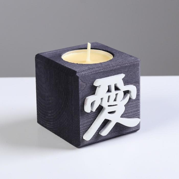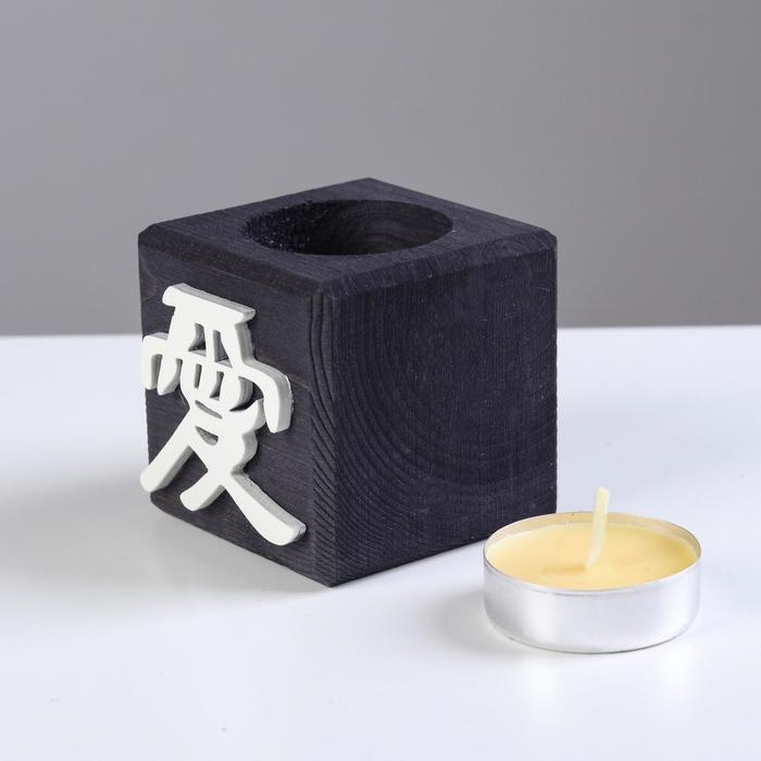 Свеча в деревянном подсвечнике "Куб, Иероглифы. Любовь", эбен, аромат манго