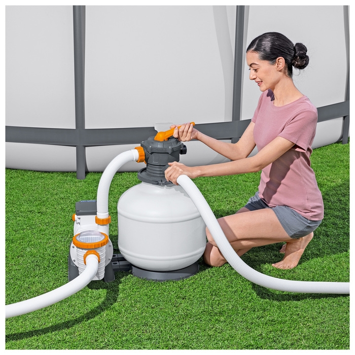 Песочный фильтр-насос подключается к бассейну двумя гофрированными шлангами, и обеспечивает циркуляцию и очистку от внешних загрязнителей. Имеется 6 режимов работы с обратной промывкой, а также манометр и таймер. С крупным мусором поможет справиться установленный скиммер. Производит очистку воды лучше чем картриджный фильтр-насос.