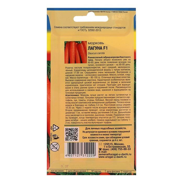 Начало уборки возможно уже на 60-65 день после появления всходов (на пучок), основного урожая – на 80-85 день. Розетка листьев полураскидистая, лист средний, мелкорассечённый. Корнеплоды цилиндрической формы с тупым кончиком, длиной 17-20 см. Сердцевина очень маленькая. Внутренняя и наружная окраска – интенсивно-оранжевая. Мякоть сочная, сладкая. Масса корнеплода – 80-150 гр. Отличные вкусовые качества. Высокое содержание каротина. Характерной особенностью является однородный урожай выровненных по форме и величине корнеплодов, практически нет отходов. Пригоден для выращивания в очень ранние сроки и подзимний посев. Рекомендуется для использования в свежем виде, хранения и выращивания на пучковую продукцию.