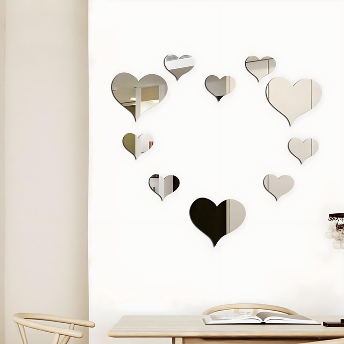 Добавьте нотку романтики и тепла в ваш интерьер с этим стильным набором зеркальных наклеек в форме сердечек! Комплект включает десять элементов различных размеров (от 9 до 15 см), изготовленных из высококачественного акрила. Каждая наклейка имеет зеркальную поверхность, которая отражает свет и придает декору дополнительную объемность и глубину.