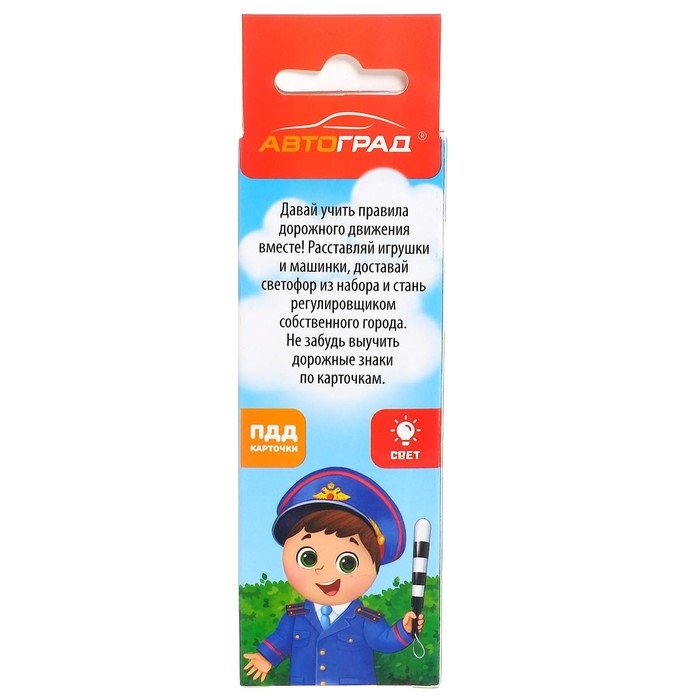 С набором «Изучаем ПДД» прогулки на улице станут для малыша безопаснее. Обучающие карточки в наборе помогут ребёнку изучить знаки, по которым он сможет ориентироваться на проезжей части. Набор поможет ребёнку в игровой форме изучить правила дорожного движения и узнать, как вести себя на дороге. Светофор в комплекте имеет звуковые и световые эффекты, что поможет воссоздать реальную ситуацию на дороге, придумать варианты развития событий и заранее обезопасить себя от чрезвычайных ситуаций.
