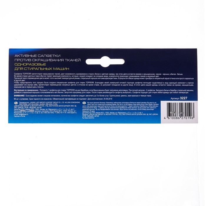 Активные салфетки для стирки препятствуют окрашиванию тканей и дают возможность стирать белую и разноцветную одежду вместе. Краски остаются яркими и насыщенными, чёрное — чёрным, а белое — белым.