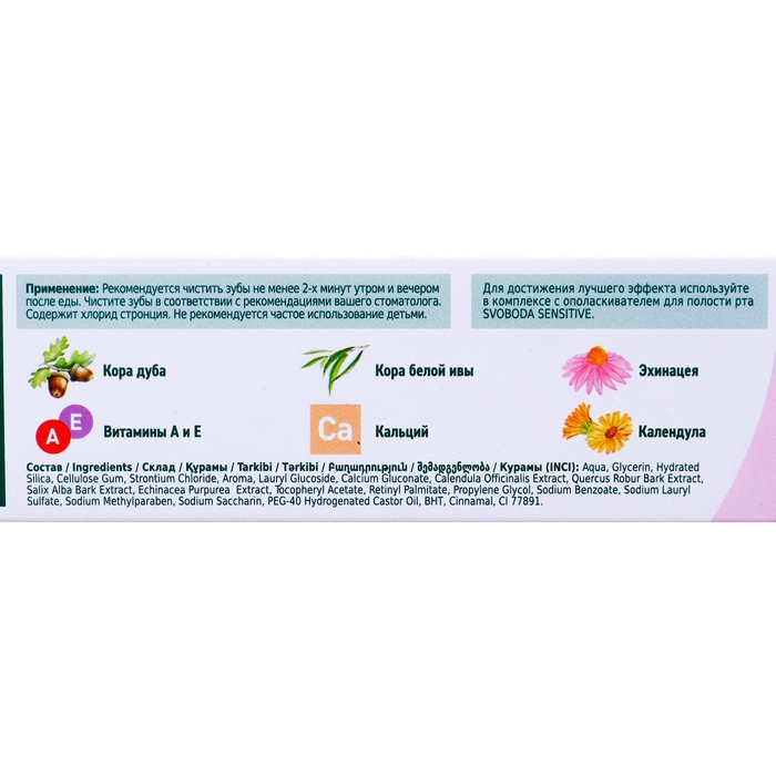 Благодаря использованию специально подобранной щадящей очищающей системы и мягкого пенообразующего вещества на основе природного сырья зубная паста "Svoboda. Sensitive" подходит для деликатного ухода за чувствительными зубами. Биологически активный компонент - хлорид стронция - создает защитный барьер, устраняющий действие раздражителей и блокирует их передачу на нервные окончания тканей зуба. Целебный сбор коры дуба, коры белой ивы, календулы лекарственной и эхинацеи способствует укреплению и защите десен. Соединение кальция - источник кальция, необходимого для укрепления ослабленной эмали. Витамины Е и А, входящие в состав зубной пасты "Svoboda. Sensitive", известны своим антиоксидантным действием.