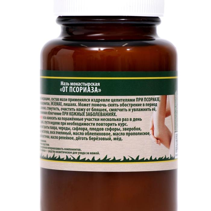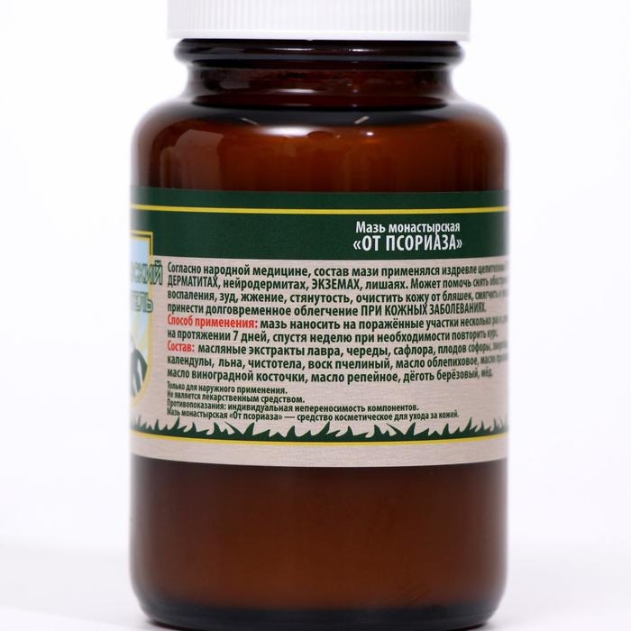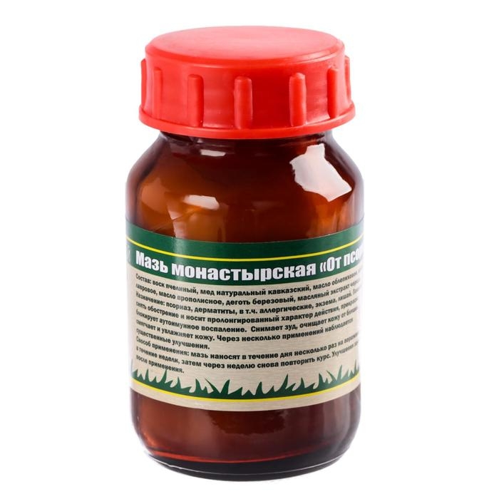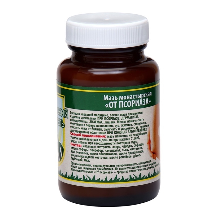 Мазь монастырская от псориаза помогает снять обострение, снимает зуд, очищает кожу от бляшек, смягчает и увлажняет кожу.