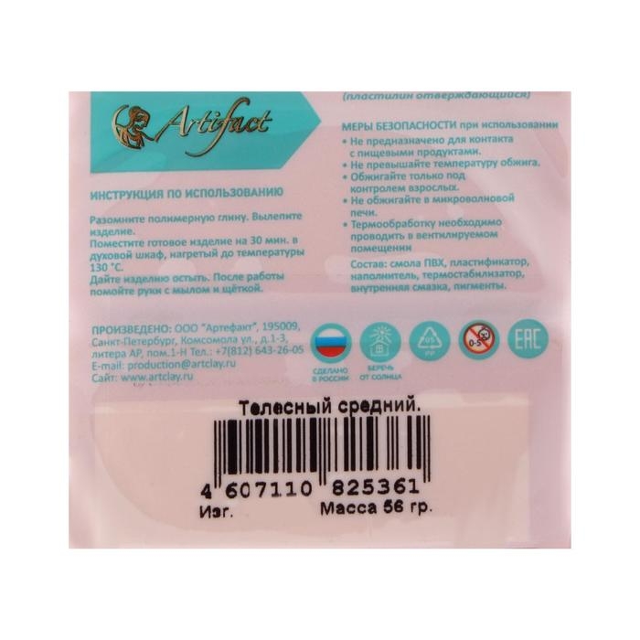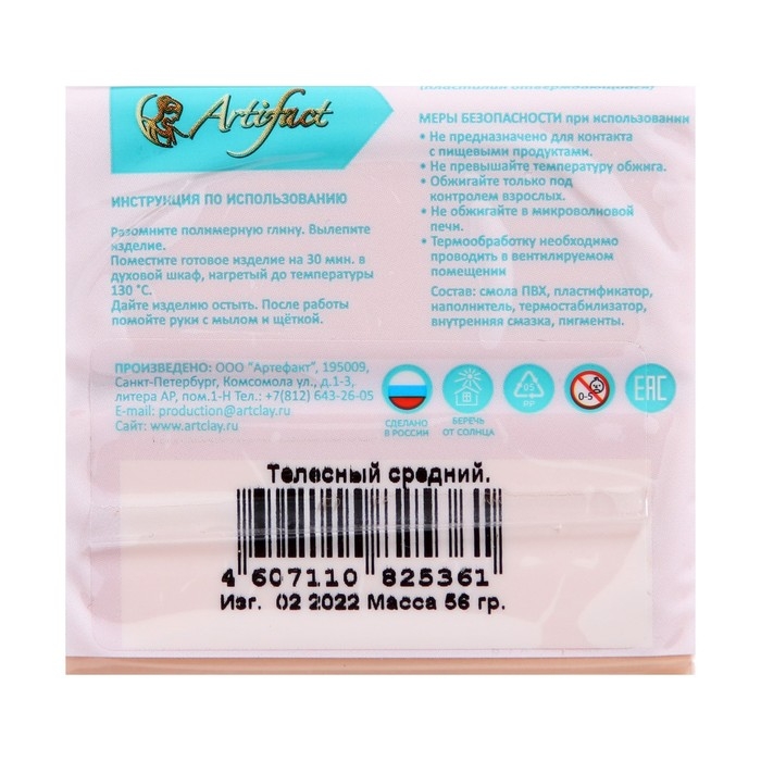 Artifact — первый в России производитель полимерной глины, который выпускает качественные и безопасные материалы для лепки и моделирования.Полимерная глина Artifact — это оптимальный вариант для того, чтобы познакомиться с материалом и сделать первый шедевр. Цвет не меняется после запекания. Легко смешивается с другими для получения ярких оттенков.По внешнему виду и своей податливости полимерная глина похожа на пластилин, а после запекания превращается в твёрдую пластмассу. С её помощью можно изготовить мельчайшие детали. Работать с полимерной глиной легко: изделие нужно только слепить и запечь.Обожжённые поделки хранятся длительное время. Готовые изделия можно мыть и протирать влажной салфеткой. Состав полимерной глины подобран таким образом, чтобы при хранении она не твердела, при лепке не крошилась и не пачкалась, а после запекания не ломалась. Материал безопасен, с ним может работать даже ребёнок.Подходит для профессионального использования. Рекомендовано для детей от 5 лет.