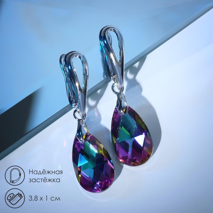 Серьги со стразами «Иллюзион» капля цвет фиолетово-зеленый в серебре