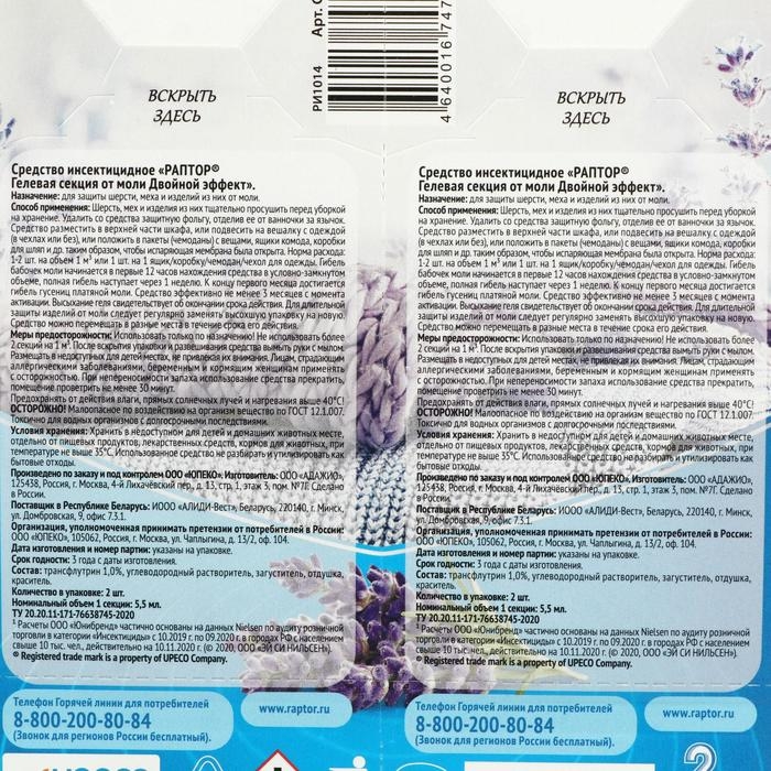 Секция от моли Раптор, гелевая, двойной эффект, с ароматом лаванды, 2 шт