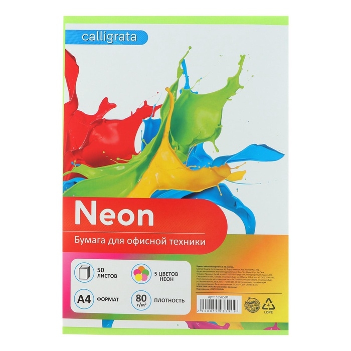 Бумага цветная А4, 50 листов, неоновая, 5 цветов, 80г/м2