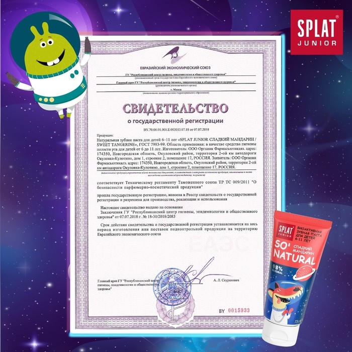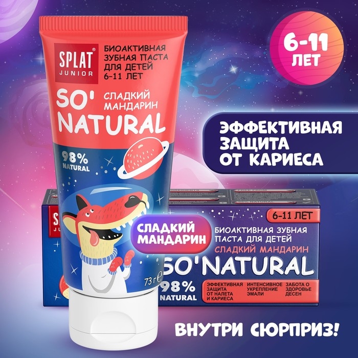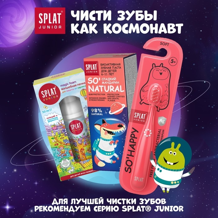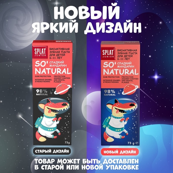 Биоактивная зубная паста SPLAT Junior «Сладкий Мандарин» в новом космическом дизайне разработана специально для детей 6-11 лет.