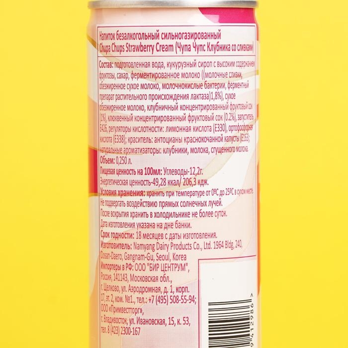 Состав: подготовленная вода, кукурузный сироп с высоким содержанием фруктозы, сахар, ферментированное молоко (молоко, обезжиренное сухое молоко, молочнокислые бактерии, лактоза), сухое обезжиренное молоко, клубничный концентрированный фруктовый сок (1 %), клюквенный концентрированный фруктовый сок (0,2 %), двуокись углерода, стабилизатор Е426, регуляторы кислотности: лимонная и ортофосфорная кислоты; краситель Е163, натуральные ароматизаторы: клубники, молока, сгущенного молока.