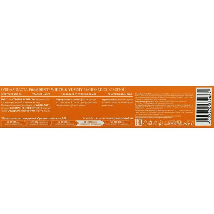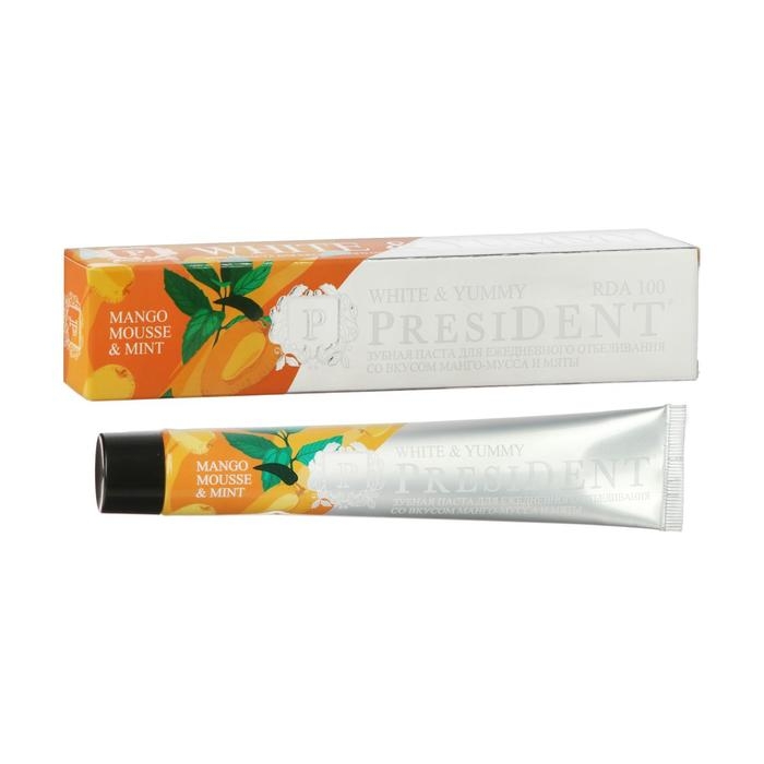 Зубная паста PRESIDENT White & Yummy со вкусом манго-мусса и мяты подходит для ежедневного отбеливания зубов. Паста осветляет эмаль, удаляет налет и стойкие пятна, защищает от образования зубного камня, освежает дыхание не содержит парабены, SLS, фтор.
