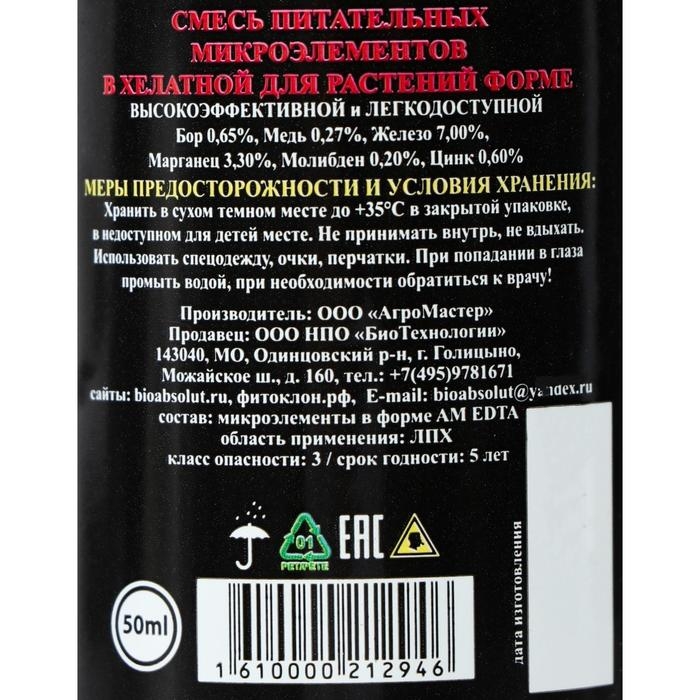 Микроудобрение в хелатной форме, для выращивания растений АгроМикс Т, 50 мл