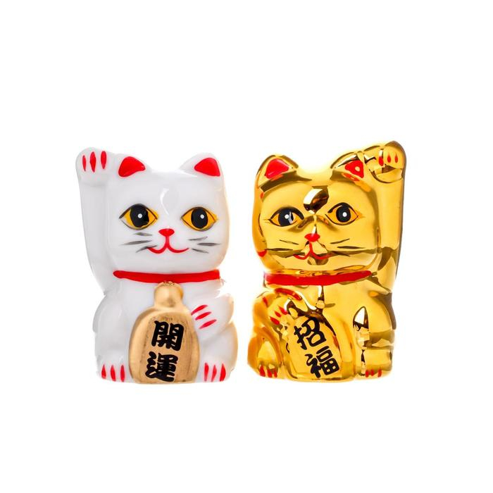 Сувенир керамика "Кот Манэки-нэко белый и золотой" набор 2 шт 5х3,3х3 см