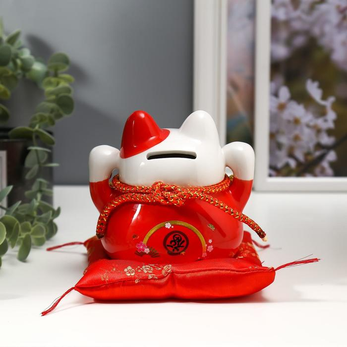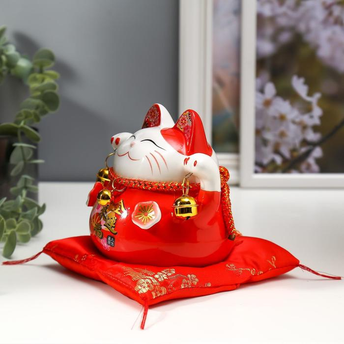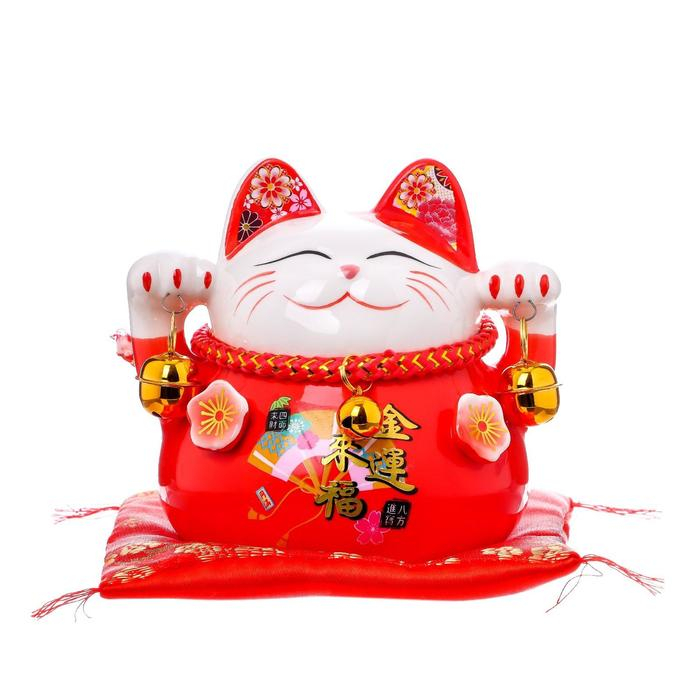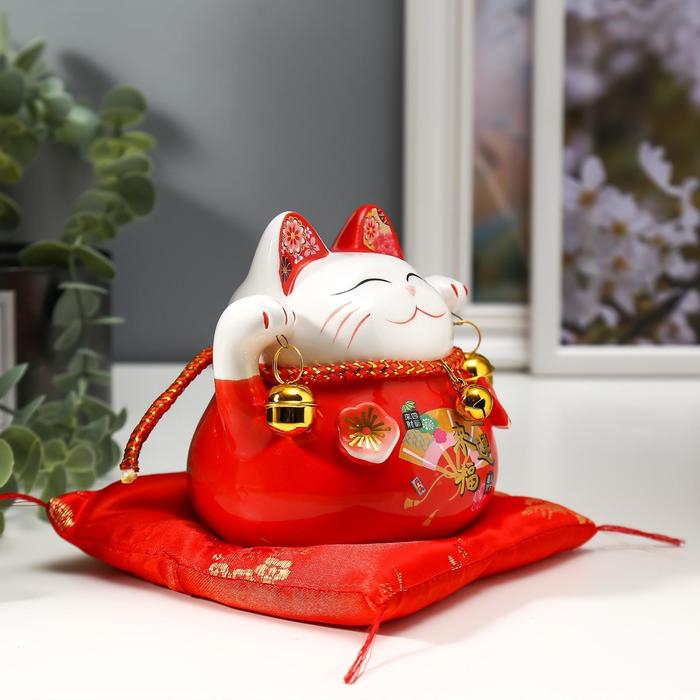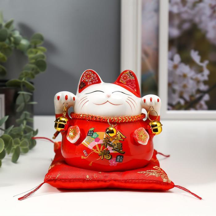 Сувенир керамика копилка "Красный кот Манэки-нэко с колокольчиками" 11,5х11,5х9,5 см