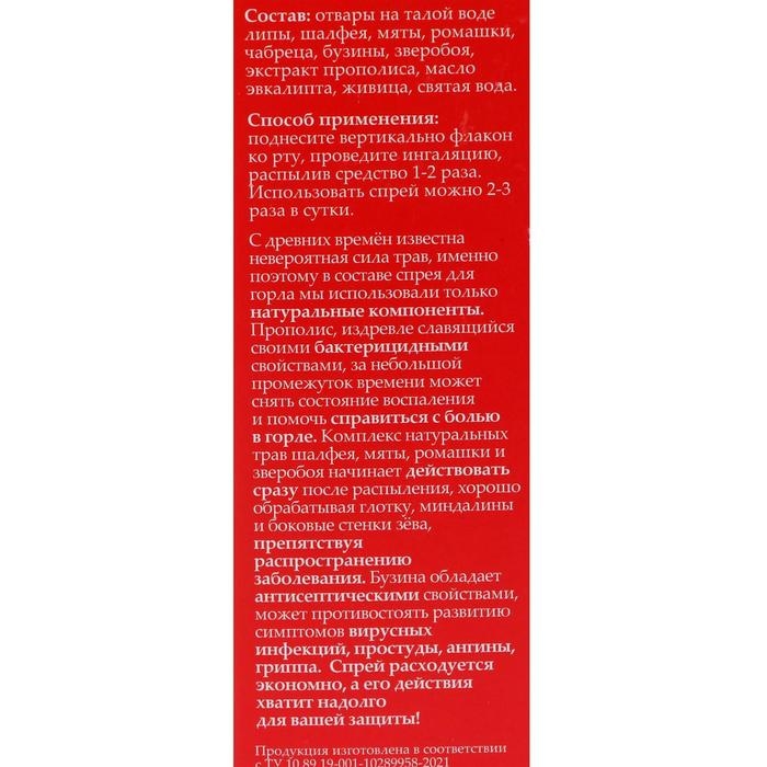 Прополис, издревле славящийся своими бактерицидными свойствами, за небольшой промежуток времени может снять состояние воспаления и помочь справиться с болью в горле. Комплекс натуральных трав шалфея, мяты, ромашки и зверобоя начинает действовать сразу после распыления, хорошо обрабатывая глотку, миндалины и боковые стенки зёва, препятствуя распространению заболевания. Бузина обладает антисептическими свойствами, может противостоять развитию симптомов вирусных инфекций, простуды, ангины, гриппа. Спрей расходуется экономно, а его действия хватит надолго для вашей защиты!
