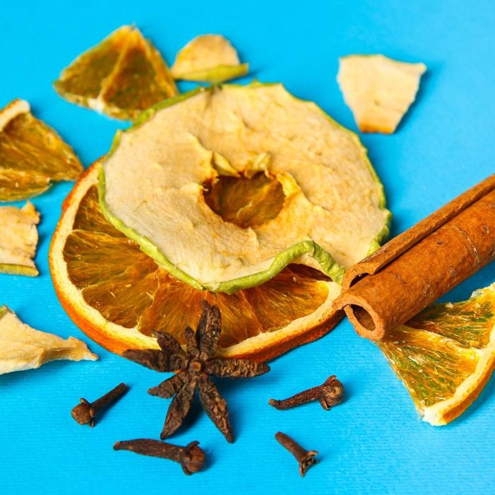 Состав: целые дольки сушеных апельсина и яблока, цедра апельсина и мандарина, палочка корицы, гвоздика, кардамон, бадьян.