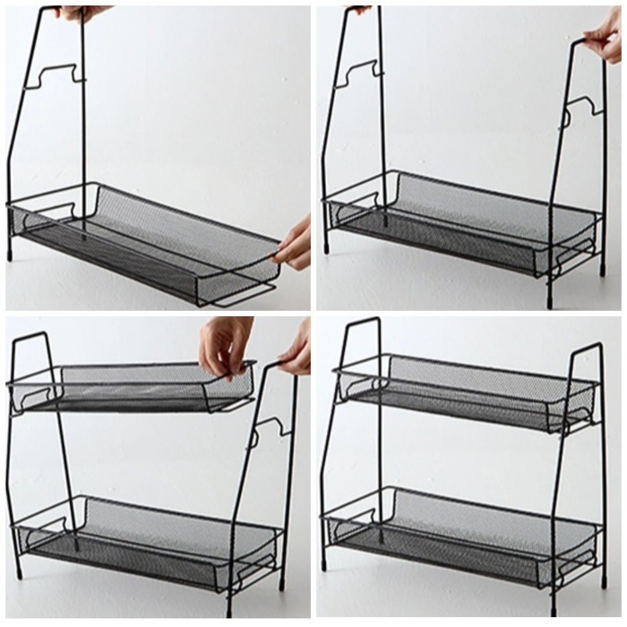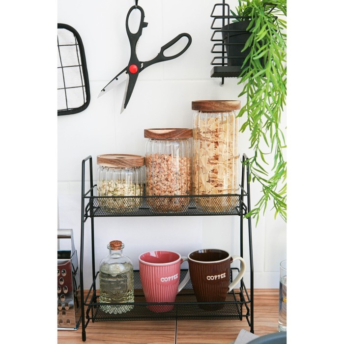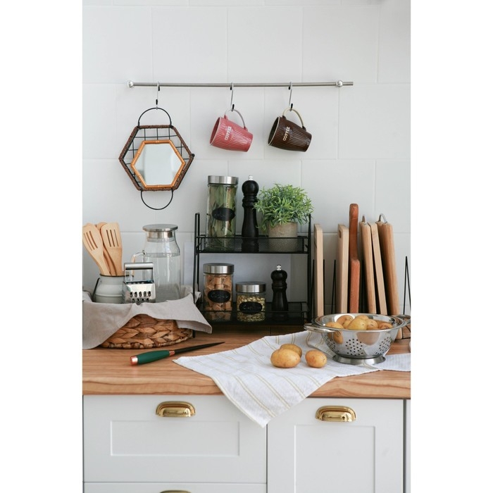 - С двумя уровнями, полка идеально подходит для хранения специй, кухонной утвари и мелочей, обеспечивая легкий доступ и порядок на вашей столешнице.