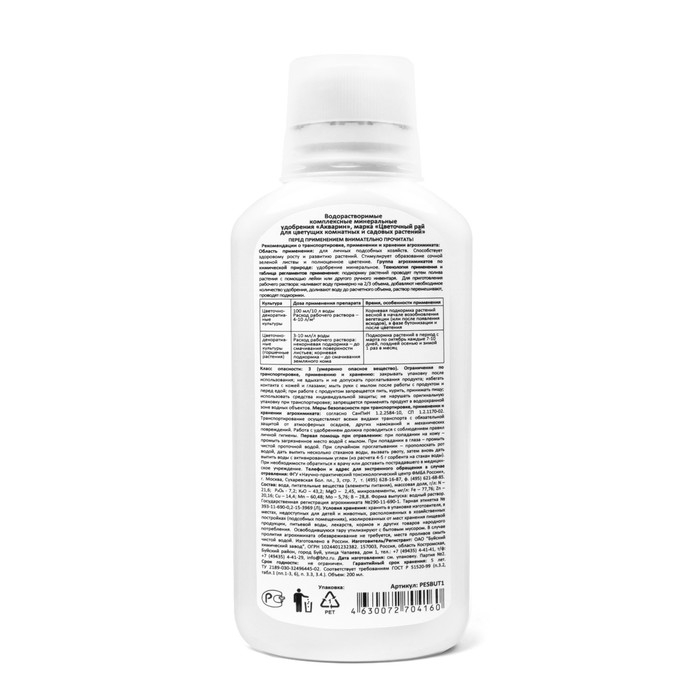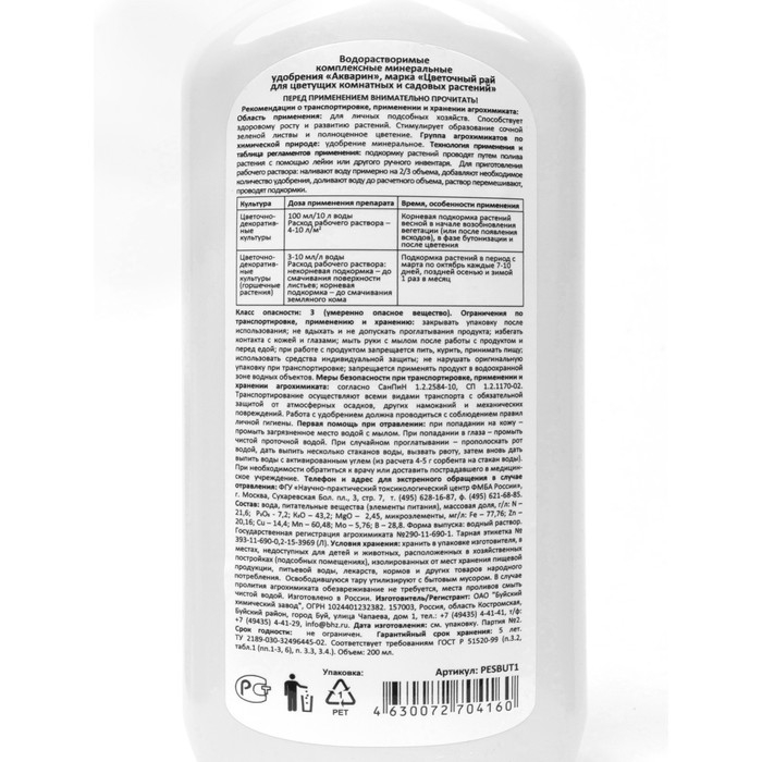 Специальное жидкое минеральное комплексное удобрение для корневых и листовых цветущих комнатных и садовых растений. Флакон оснащен мерным стаканчиком для удобства дозировки. Сбалансированный комплекс высокоэффективных, легкодоступных для растений микроэлементов. За счет этих элементов способствует здоровому росту и развитию растений. Стимулирует развитие побегов, сочной зеленой листвы, обильного и длительного цветения. Устраняет видимые проявления дефицита элементов питания, предотвращает развитие болезней, вызванных недостатком тех или иных микроэлементов. Состав: вода, питательные вещества (элементы питания), массовая доля, г/л: N – 21,6; P2O5 - 7,2; К2О – 43,2; МgО – 2,45, микроэлементы, мг/л: Fe – 77,76; Zn – 20,16; Cu – 14,4; Mn – 60,48; Mo – 5,76; B – 28,8. Форма выпуска: водный раствор. Цвет жидкости желтый.