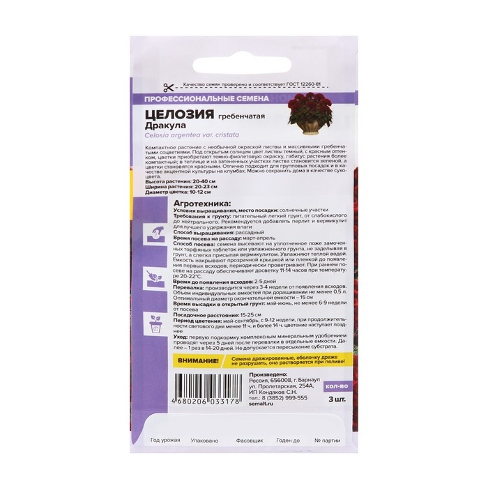 Семена цветов Целозия "Дракула", гребенчатая, Сем. Алт, ц/п, 3 шт