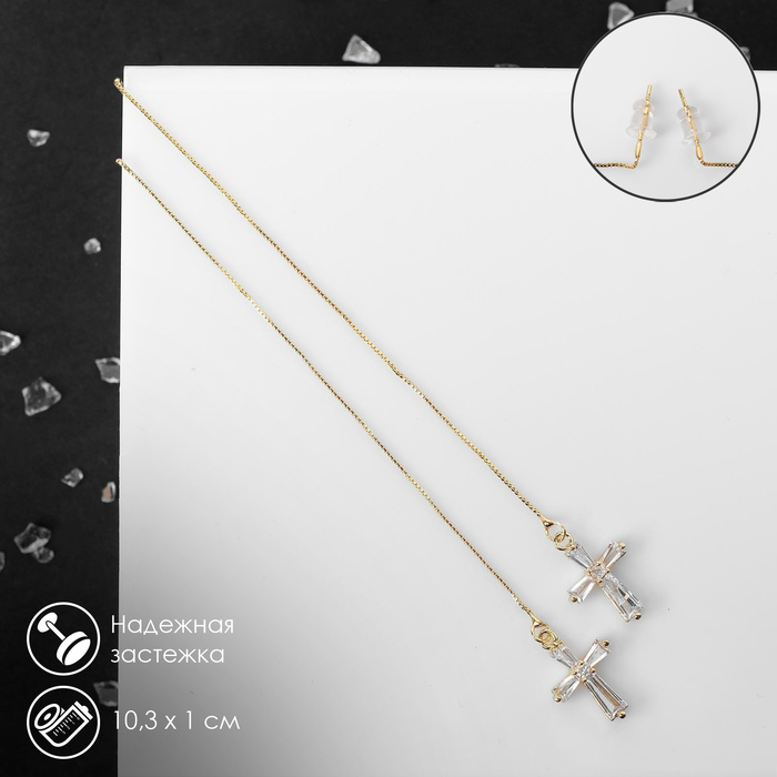 Серьги висячие со стразами «Крестик» на цепочке, цвет белый в золоте, 10,3 см