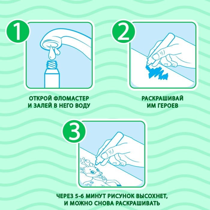 - Через 5–6 минут вода высохнет, и картинку можно снова раскрашивать.