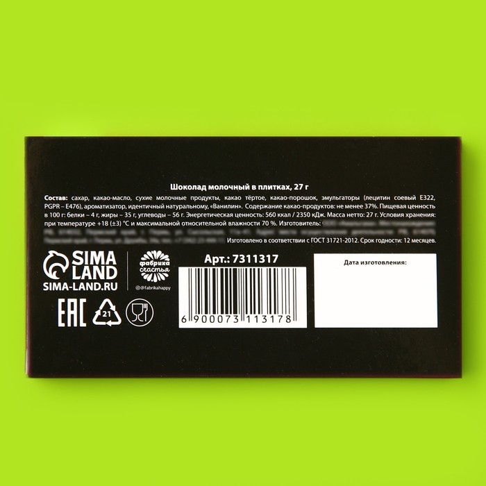 Состав: сухое цельное молоко, какао тёртое, масло какао, сухая молочная сыворотка, обезвоженный молочный жир, сахар, эмульгатор – соевый лецитин, ароматизатор, идентичный натуральному, «Ванилин».