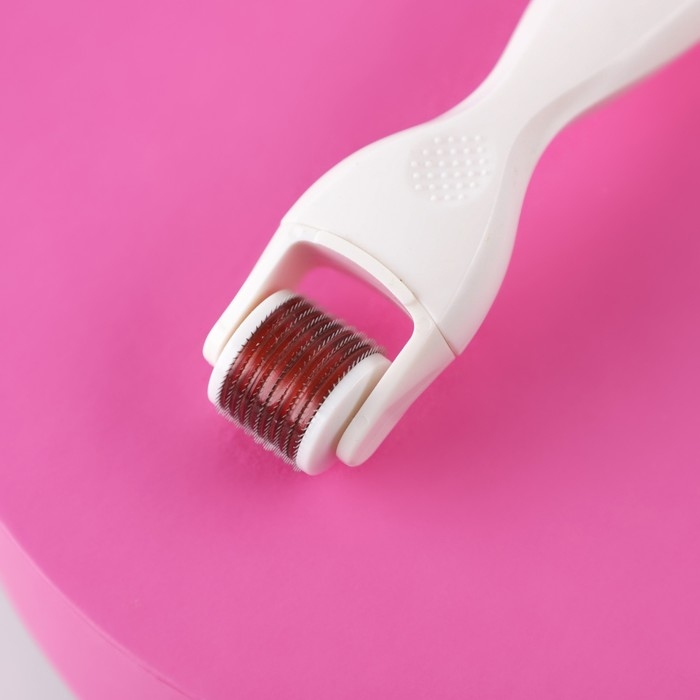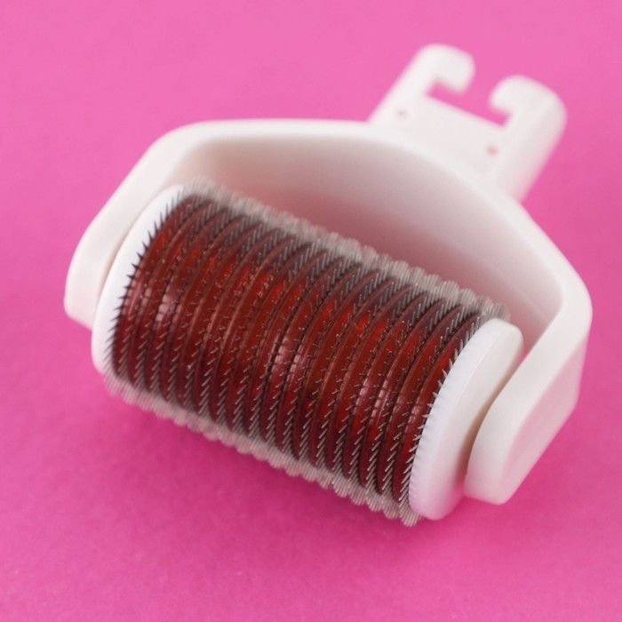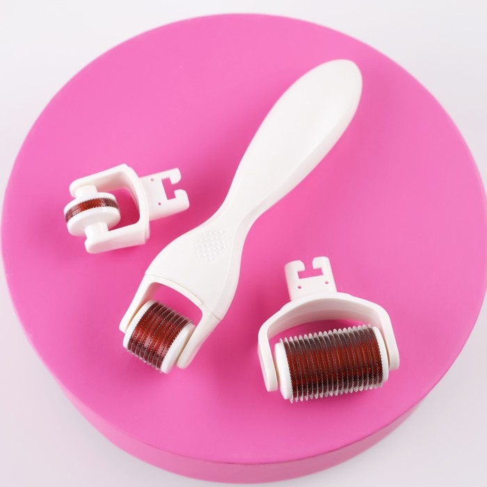 Мезороллер со сменными насадками для лица, головы и тела представляет собой валик с тончайшими иглами из стали.
