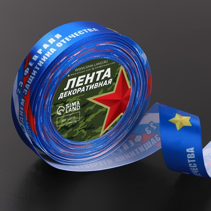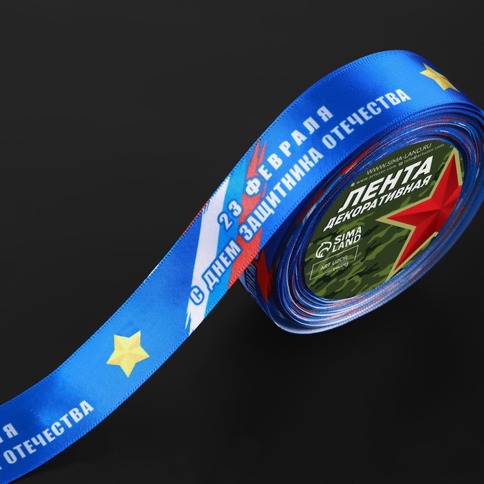 Лента атласная «С Днём защитника Отечества», 25 мм × 18 ± 1 м, цвет синий