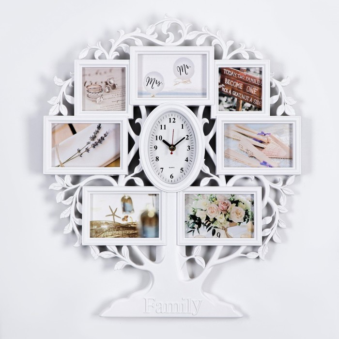 Вы сможете обновлять фотоколлаж по вашему желанию, добавляя новые фотографии или меняя их. Общий размер фотоколлажа – 60.5 х 51.5 см. Фоторамка коллаж выполнена в белом цвете. Привлекает внимание к самим фотографиям, создавая эффектный контраст и придающий вашим семейным снимкам особую гармонию и красоту. Фоторамка-часы в виде дерева олицетворяет дерево как символ жизни, роста и развития. Дерево ассоциируется с семьей, историей и корнями, что делает эту фоторамку особенно подходящей для размещения в интерьере. Она станет незаменимым аксессуаром в любом доме, комнате и даже офисе.