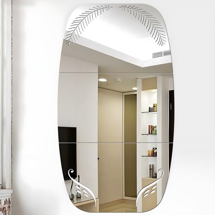 Зеркало настенное, размер 60 х 30 см, изготовленное из акрила толщиной 1 мм, представляет собой уникальное произведение искусства, которое станет главным акцентом в вашем интерьере. Произвольная форма зеркала придает ему динамичность и выразительность, позволяя легко интегрировать его в различные стили дизайна. Верхняя часть зеркала украшена узорами, напоминающими листья папоротника, которые симметрично располагаются по обеим сторонам, создавая гармонию и баланс. Такие элементы добавляют изделию легкости и воздушности, ассоциируясь с природой и свободой. В нижней части зеркала находятся узоры, которые напоминают крылья ангела или жар-птицы. Придают композиции мистический и загадочный вид, привлекая внимание своей необычностью и глубиной смысла. Такое сочетание элементов превращает обычное зеркало в настоящее художественное произведение. Легкость материала и небольшая толщина делают этот декор удобным в установке и эксплуатации.