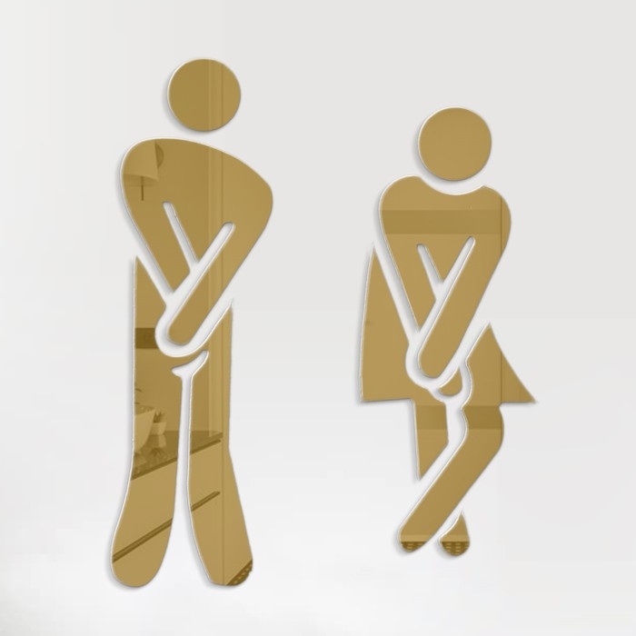 Фигуры имеют зеркальную поверхность, которая отражает свет и придаёт декору дополнительную глубину и элегантность. Значки изображают людей в позах, соответствующих процессу посещения туалета, что добавляет уникальности и привлекает внимание, помогая посетителям сразу понять, какую дверь следует выбирать.