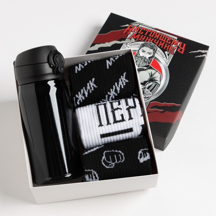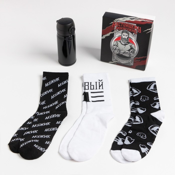 Подарочный набор термос и носки 3 пары KAFTAN "Настоящему мужчине", размер 41-44 (27-29 см)