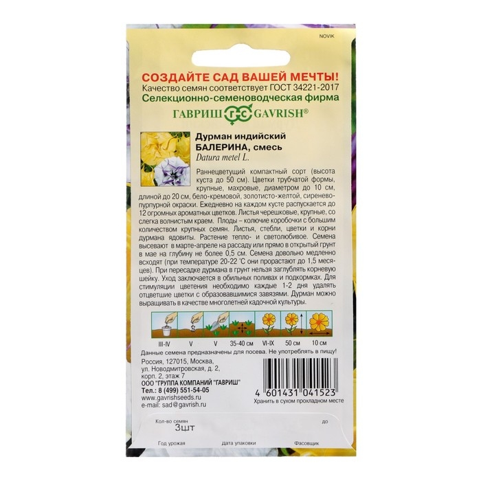 Семена цветов Дурман "Балерина", ц/п, смесь, махровая, 3 шт