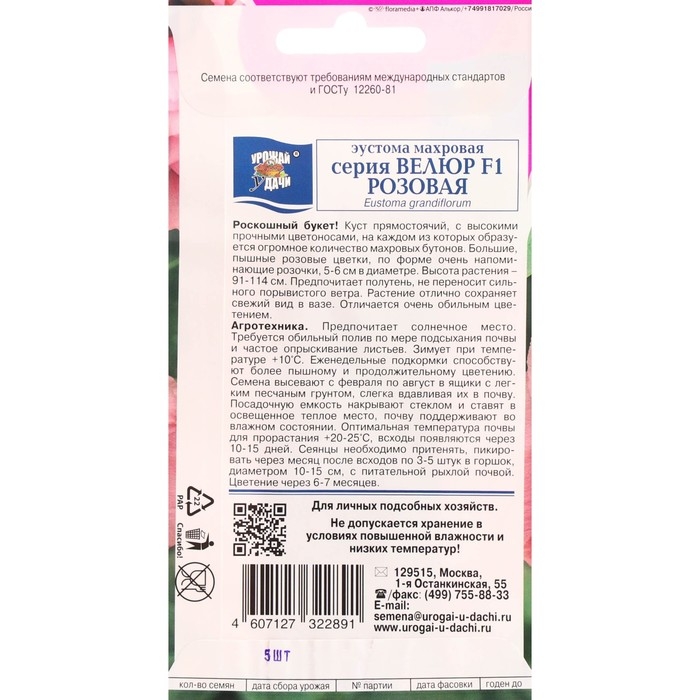 Семена цветов Эустома махровая "Велюр", розовая, F1, в ампуле, 0,005 г.