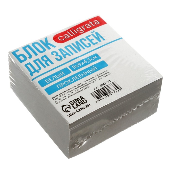Блок бумаги д/записей на склейке 9*9*4,5 Calligrata белый, 65г/м2, белиз 92%