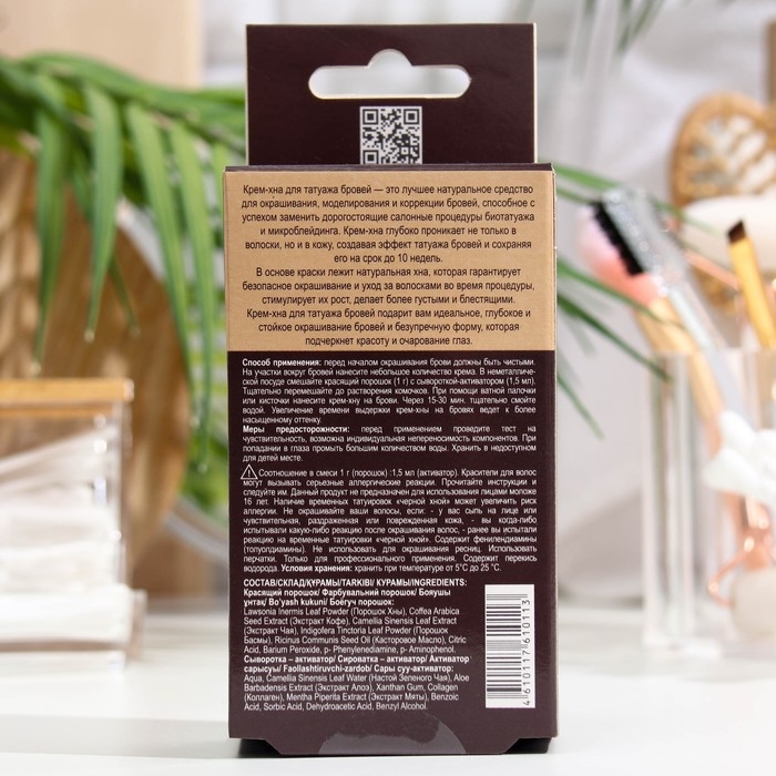 Крем-Хна для татуажа бровей — это лучшее натуральное средство для окрашивания, моделирования и коррекции бровей, способное с успехом заменить дорогостоящие салонные процедуры биотатуажа и микроблейдинга. Крем-Хна глубоко проникает не только в волоски, но и в кожу, создавая эффект татуажа бровей и сохраняя его на срок до 10 недель. В основе краски лежит натуральная хна, которая гарантирует безопасное окрашивание и уход за волосками во время процедуры, стимулирует их рост, делает более густыми и блестящими. Крем-Хна для татуажа бровей подарит вам идеальное, глубокое и стойкое окрашивание бровей и безупречную форму, которая подчеркнет красоту и очарование глаз.