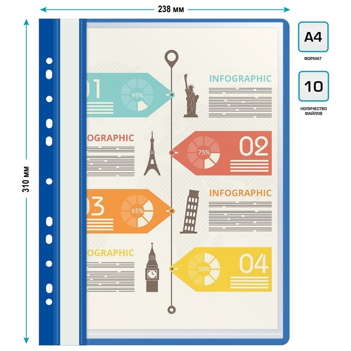 Папка с 10 вкладышами А4, 160 мкм, Calligrata, с перфорацией, синяя
