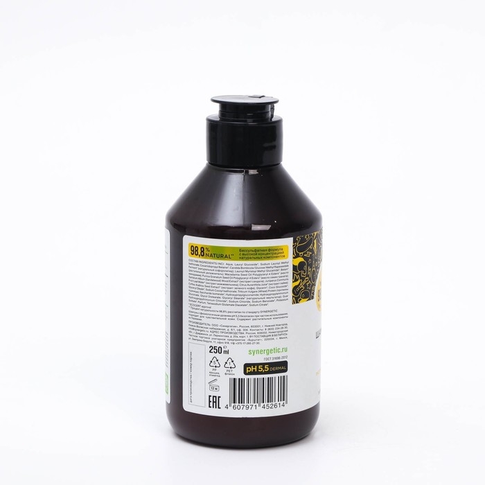 Натуральный бессульфатный шампунь и гель для душа 2 в 1 мужской SYNERGETIC "Энергия и сила" - эффективное средство для очищения тела, кожи головы и всех типов волос. Бессульфатный шампунь и гель для душа "2 в 1" обеспечивает деликатное очищение и эффективный уход. Формула с протеином восстанавливает поврежденные волосы, укрепляет и оздоравливает их структуру. Комплекс масел гранатовой косточки и макадамии, который оказывает восстанавливающее действие. Инновационные компоненты шампуня укрепляют волосы и стимулируют формирование кератиновых волокон. Экстракты сандала, можжевельника и зеленого кофе активизируют волосяные луковицы и стимулируют рост волос. Мультифункциональный компонент натурального происхождения софоролипид мягко очищает кожу головы и сохраняет естественный микробиом кожи. Нанести небольшое количество шампуня на влажные волосы и/или тело, хорошо вспенить и тщательно смыть водой. При необходимости повторить процедуру. Возможно появление естественного осадка натурального происхождения и незначительное изменение цвета шампуня, не влияющие на его качество и свойства. Только для наружного применения. Беречь от детей. При попадании средства в глаза промыть водой. Использовать строго по назначению. Aqua; Lauryl Glucoside; Sodium Lauroyl Methyl Isethionate; Cocamidopropyl Betaine; Candida Bombicola/Glucose/Methyl Rapeseedate Ferment; Lauroyl/Myristoyl Methyl Glucamide; Inulin (растительный пребиотик); Macadamia Seed Oil Polyglyceryl-4 Esters (масло макадамии); Pumpkin Seed Oil Polyglyceryl-4 Esters (масло тыквенных семечек); Olive Oil Polyglyceryl-4 Esters (масло оливы); Cymbopogon Citratus Extract (экстракт лемонграсса); Plumeria Alba Flower Extract (экстракт франжипани); Glycerin; Coco Glucoside; Glyceryl Oleate; Sodium Cocoyl Isethionate; Triticum Vulgare (Wheat) Protein; Saccharide Isomerate; Hydroxypropylgluconamide; Hydroxypropylammonium Gluconate; Glycol Distearate; Glyceryl Stearate; Persea Gratissima Oil (масло авокадо); Guar Hydroxypropyltrimonium Chloride; Sodium Chloride; Sodium Benzoate; Parfum; Tetrasodium Glutamate Diacetate; Sodium Citrate.
