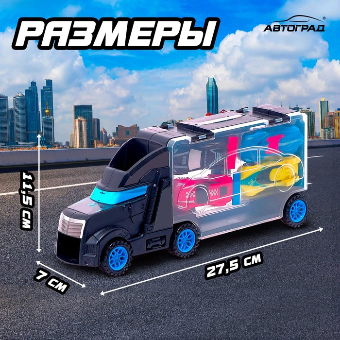 «Перевозчик» готов доставить спорткары для скоростных соревнований в любое время и в любое место. Загрузите машины в кузов автомобиля и начинайте игру. С яркими болидами игровым сюжетам не будет предела. Ребёнок устроит настоящие гонки и будет состязаться с друзьями в быстрой и манёвренной езде.