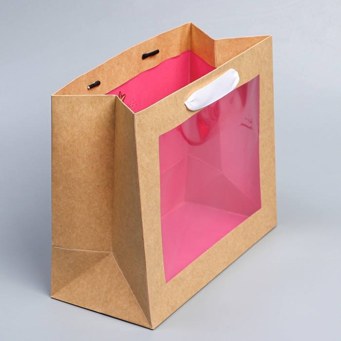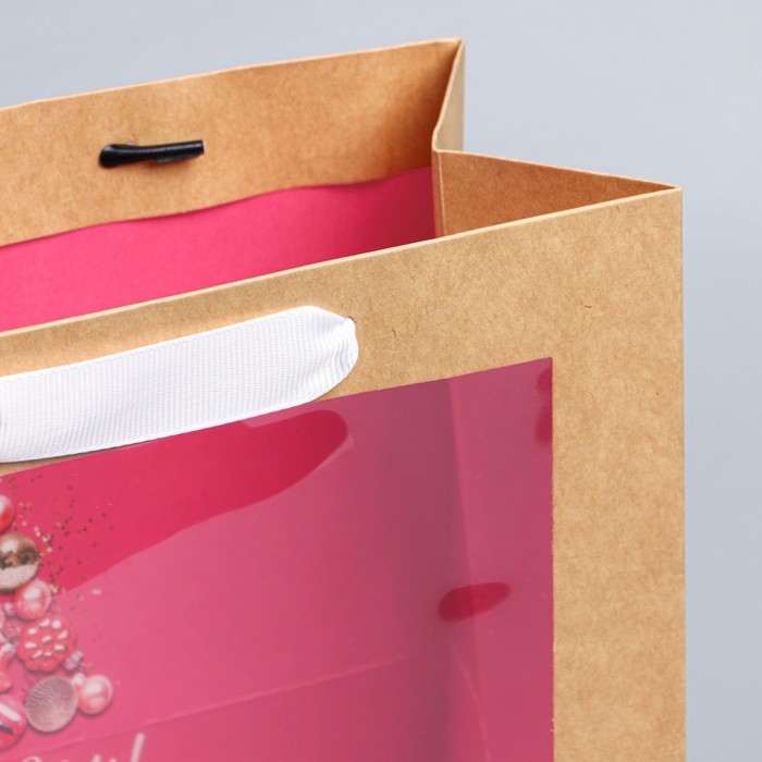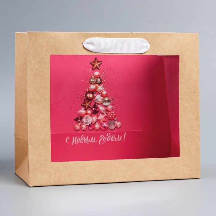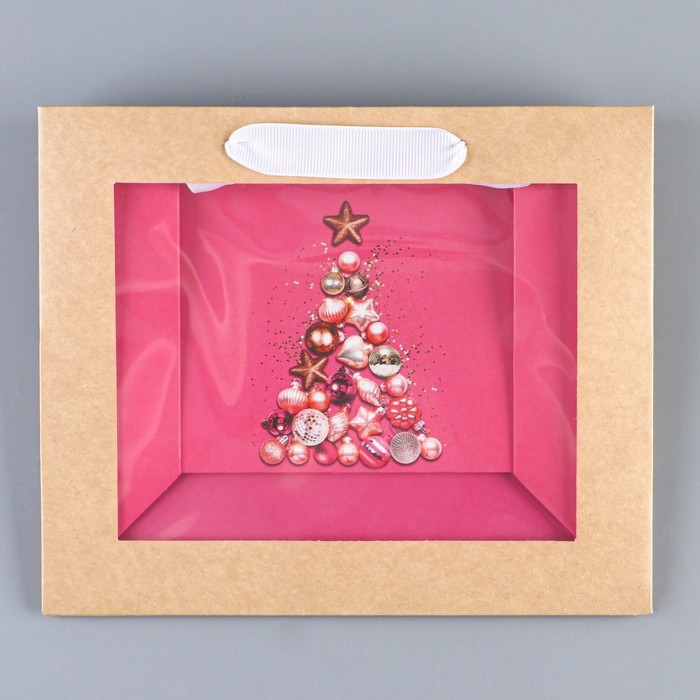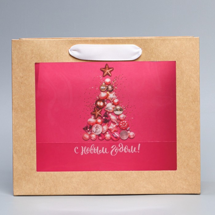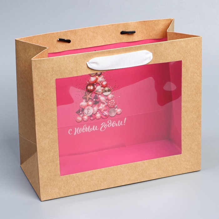 Пакет подарочный новогодний крафтовый с пластиковым окном «Новогодние шары», 24 х 20 х 11см