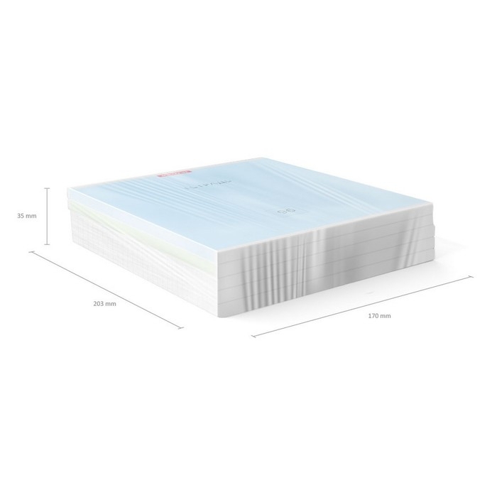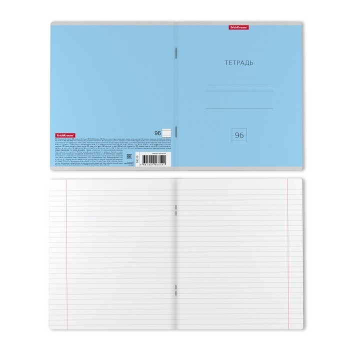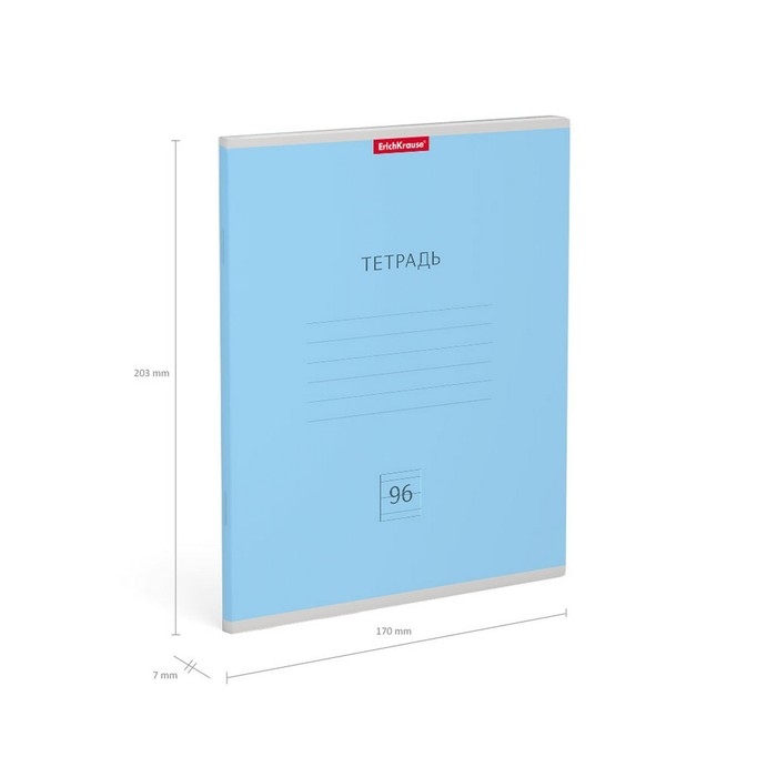 Тетрадь общая формата А5+ (170 х 203 мм). Обложка из высококачественного мелованного картона плотностью 190 г/м2. В блоке 96 листов в линейку с полями. Бумага офсетная плотностью 60 г/м2. Цвет линовки - синий. Скругленные уголки обложки и блока. Тип скрепления - скоба. Тетради разных цветов упакованы в термоусадочную пленку по 5 штук.