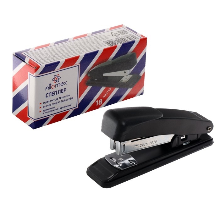 Степлер "Attomex" 24/6&26/6 (мощность 18 листов, глубина скрепления 45 мм) металлический, в картонной коробке, черный.