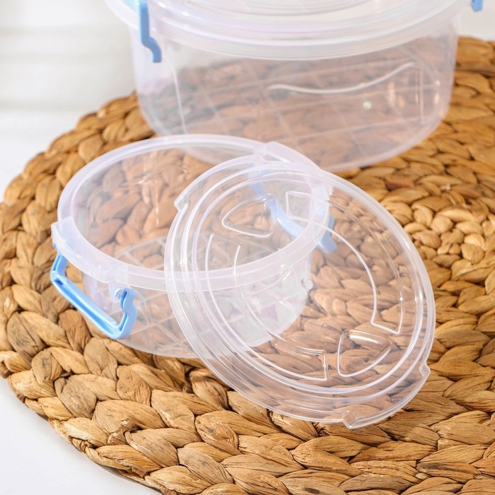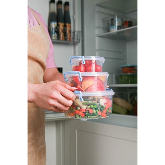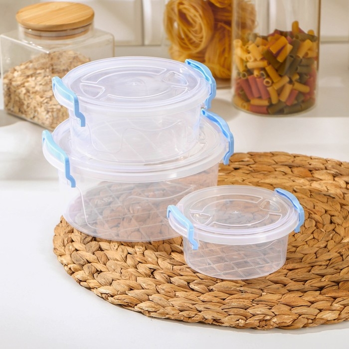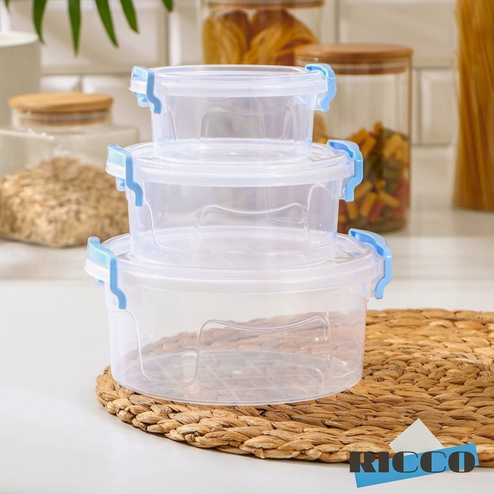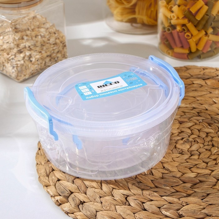 Набор контейнеров пищевых RICCO, 3 шт: 300 мл, 600 мл, 1,2 л, круглые, прозраячные, ручки голубые