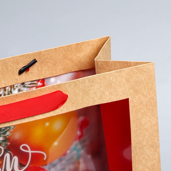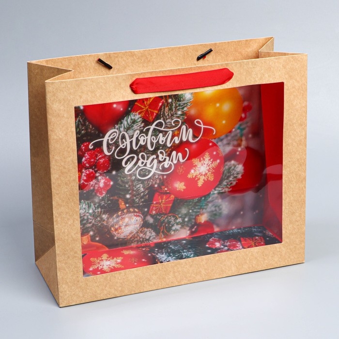 Пакет подарочный новогодний крафтовый с пластиковым окном «Happiness», 31 х 26 х 11 см